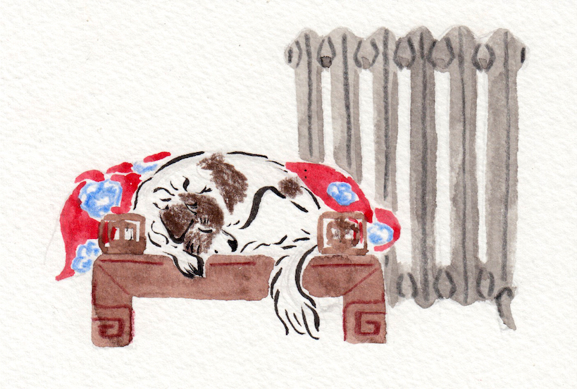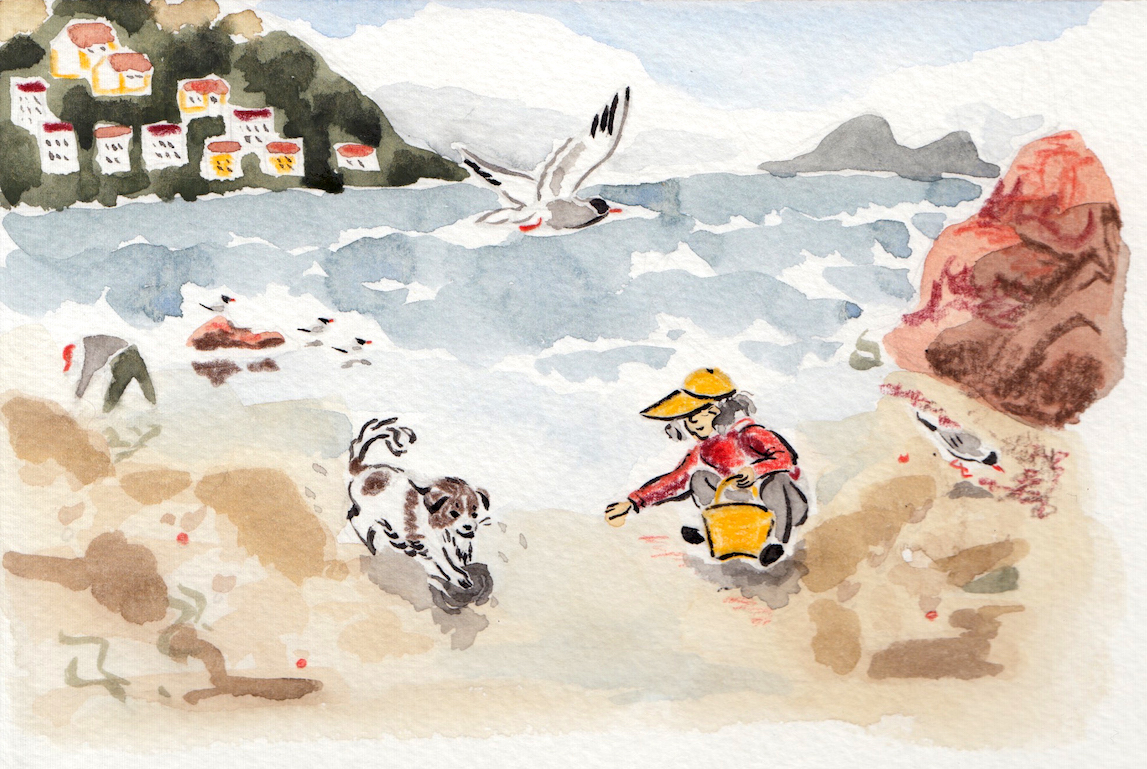 Watercolor paintings of a dog and her friends in Qingdao. 17 x 28cm, 11 x 8cm, and 16.5 x 11cm, watercolor and colored pencil on paper. 2022
