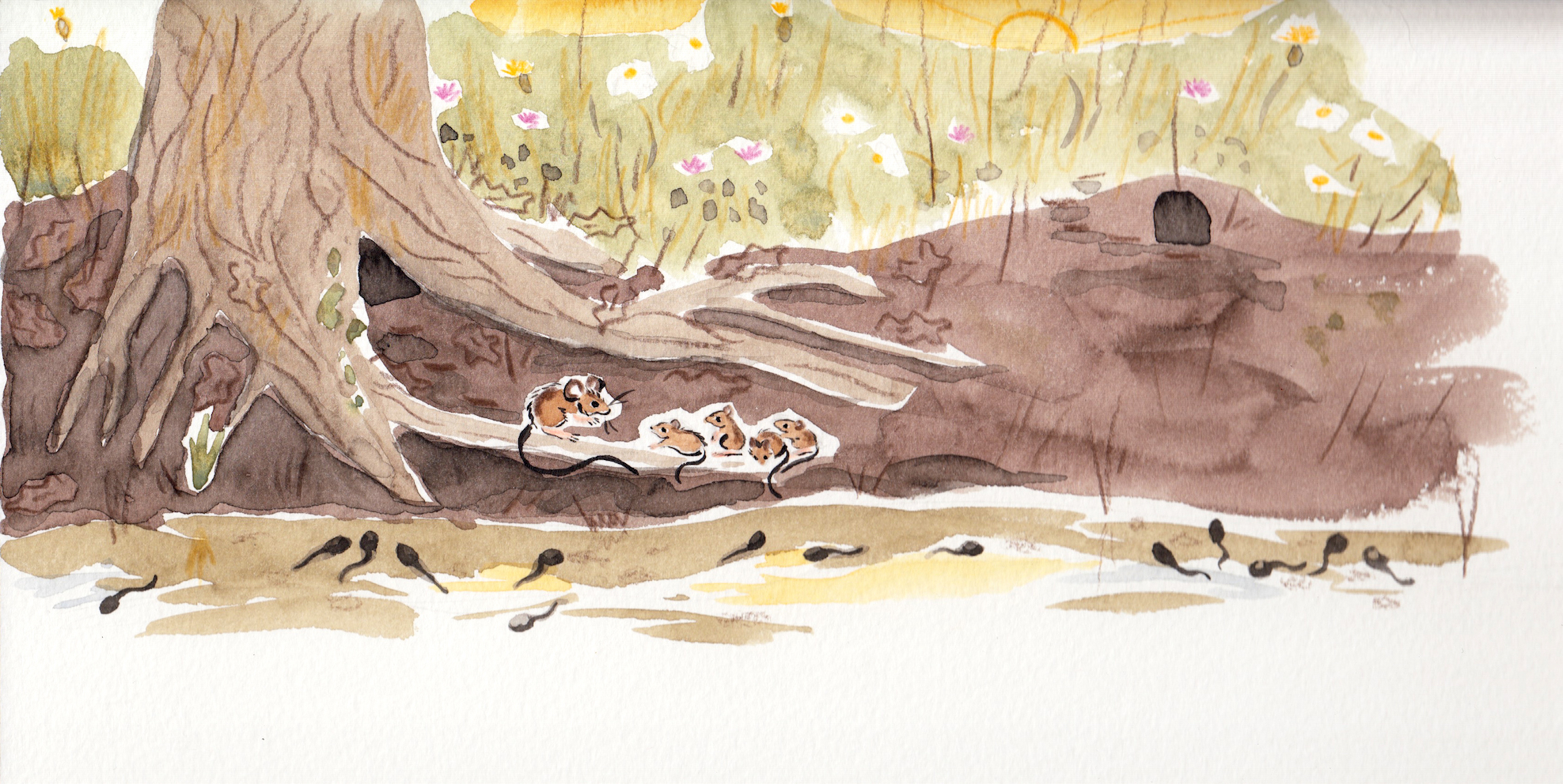 Personal project, watercolor painting based on scenes from the book Mrs. Frisby and the Rats of NIMH by Robert C. O’Brien. 28.5 x 14cm, watercolor, colored pencil and ink on paper. 2022