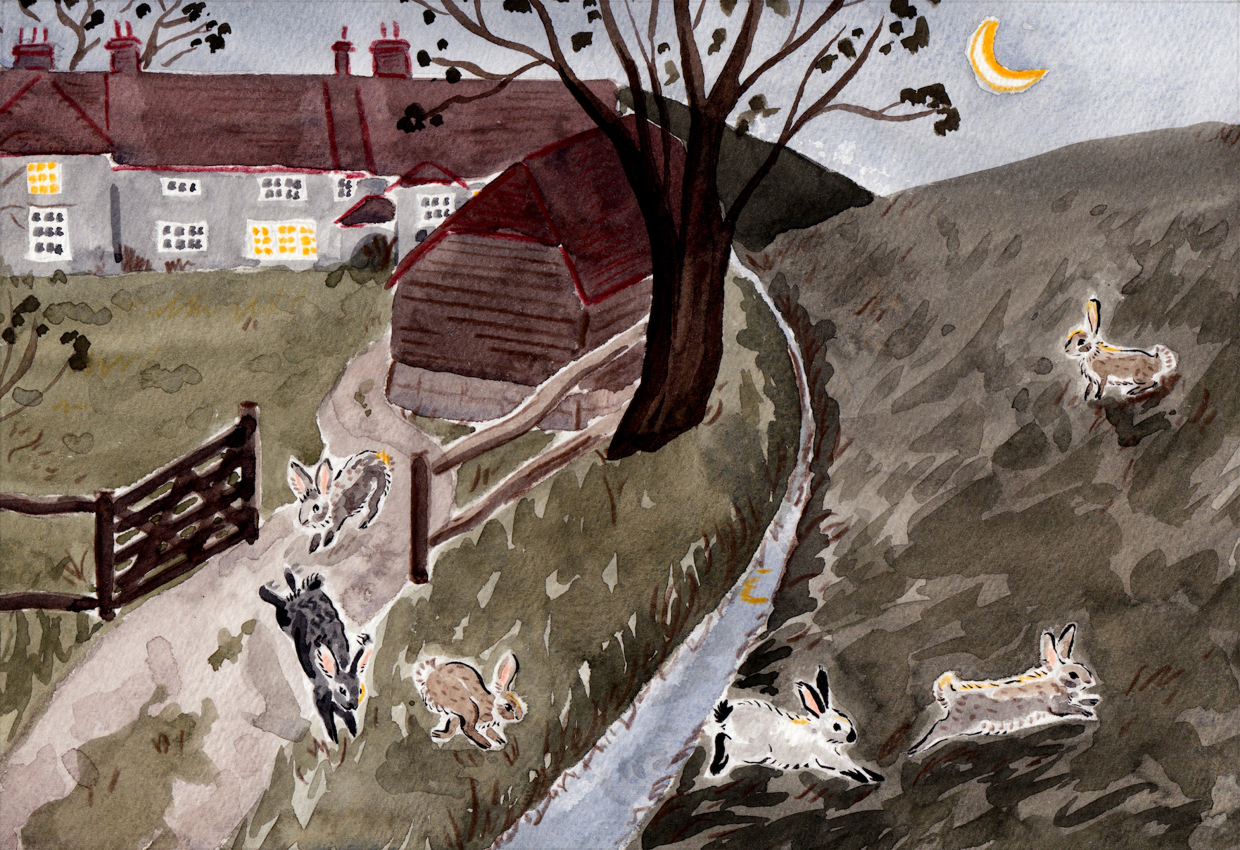 Personal project, two watercolor paintings based on scenes from the book Watership Down by Richard Adams. 25.5 x 17.5cm, watercolor and colored pencil on paper. 2022